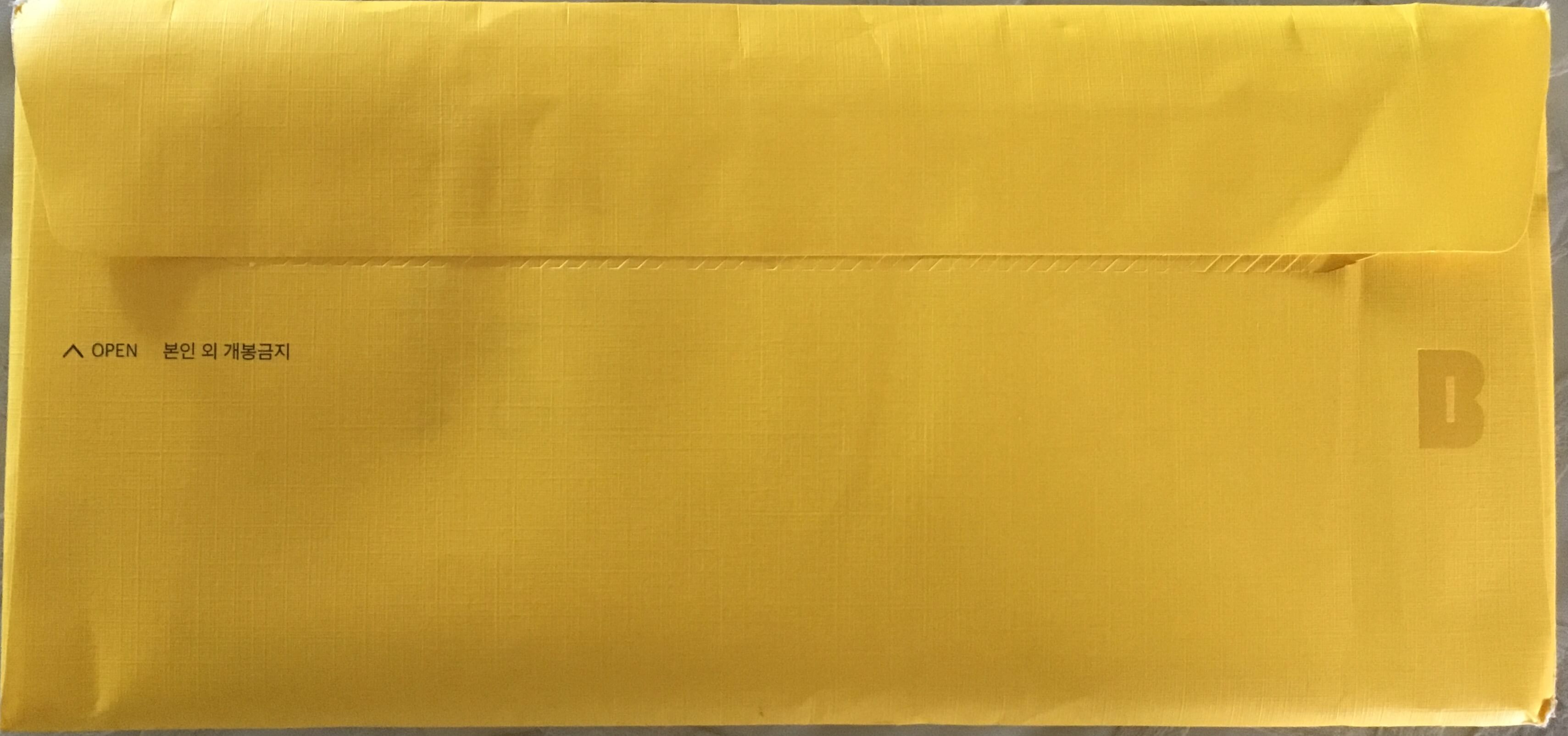 받자마자 느껴지는 카카오의 기운! 전체가 노란색으로 된 우편 봉투입니다. 앞에는 그냥 투명 필름으로 구멍만 뚫려있고, 뒷면에 인쇄된 B 모양의 로고가 전부입니다.