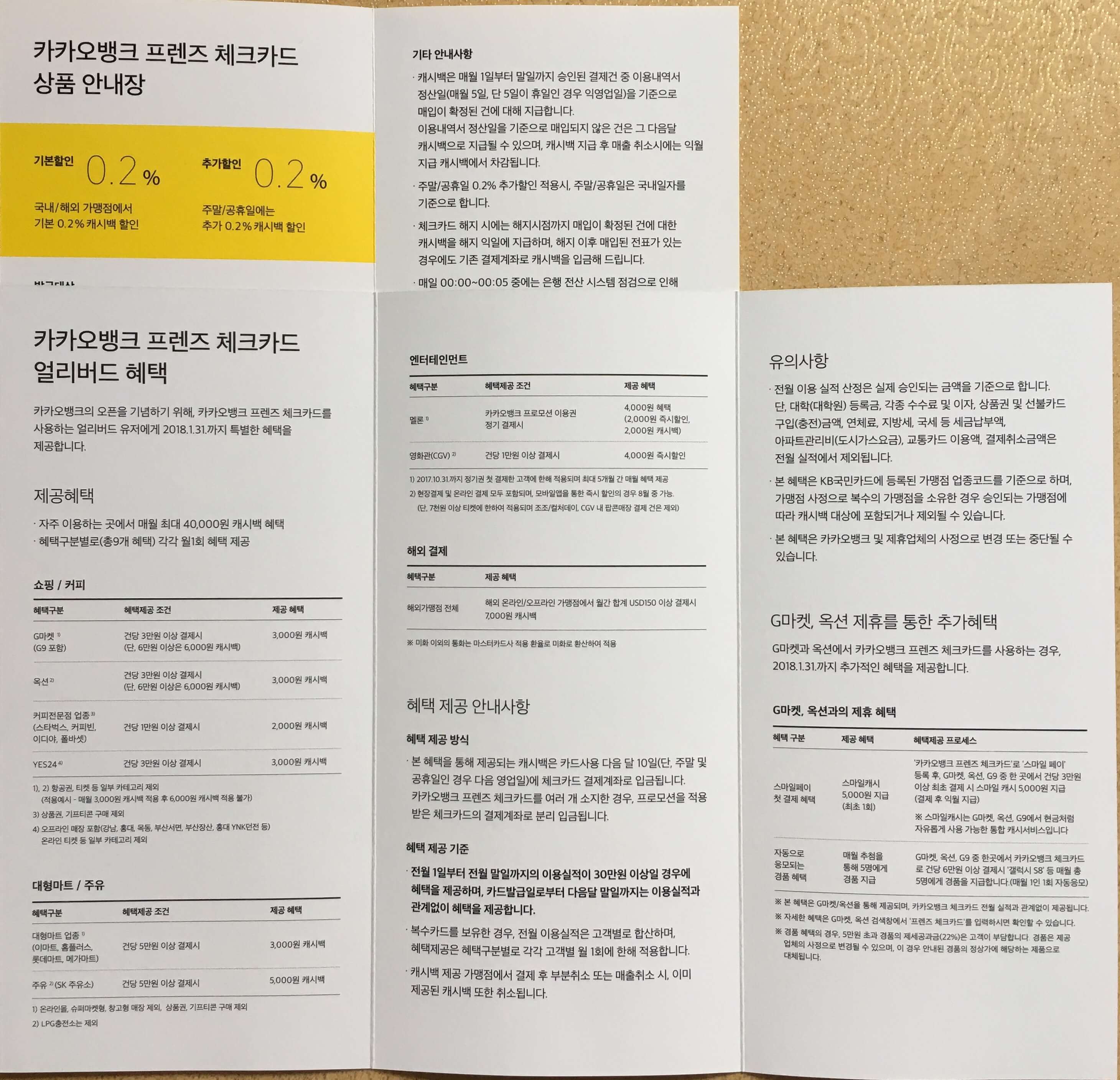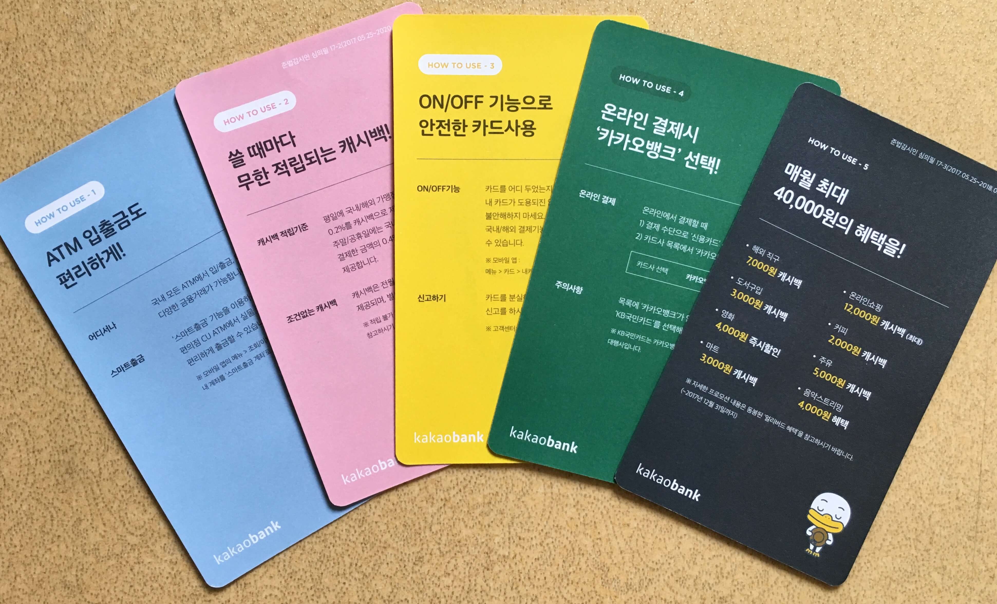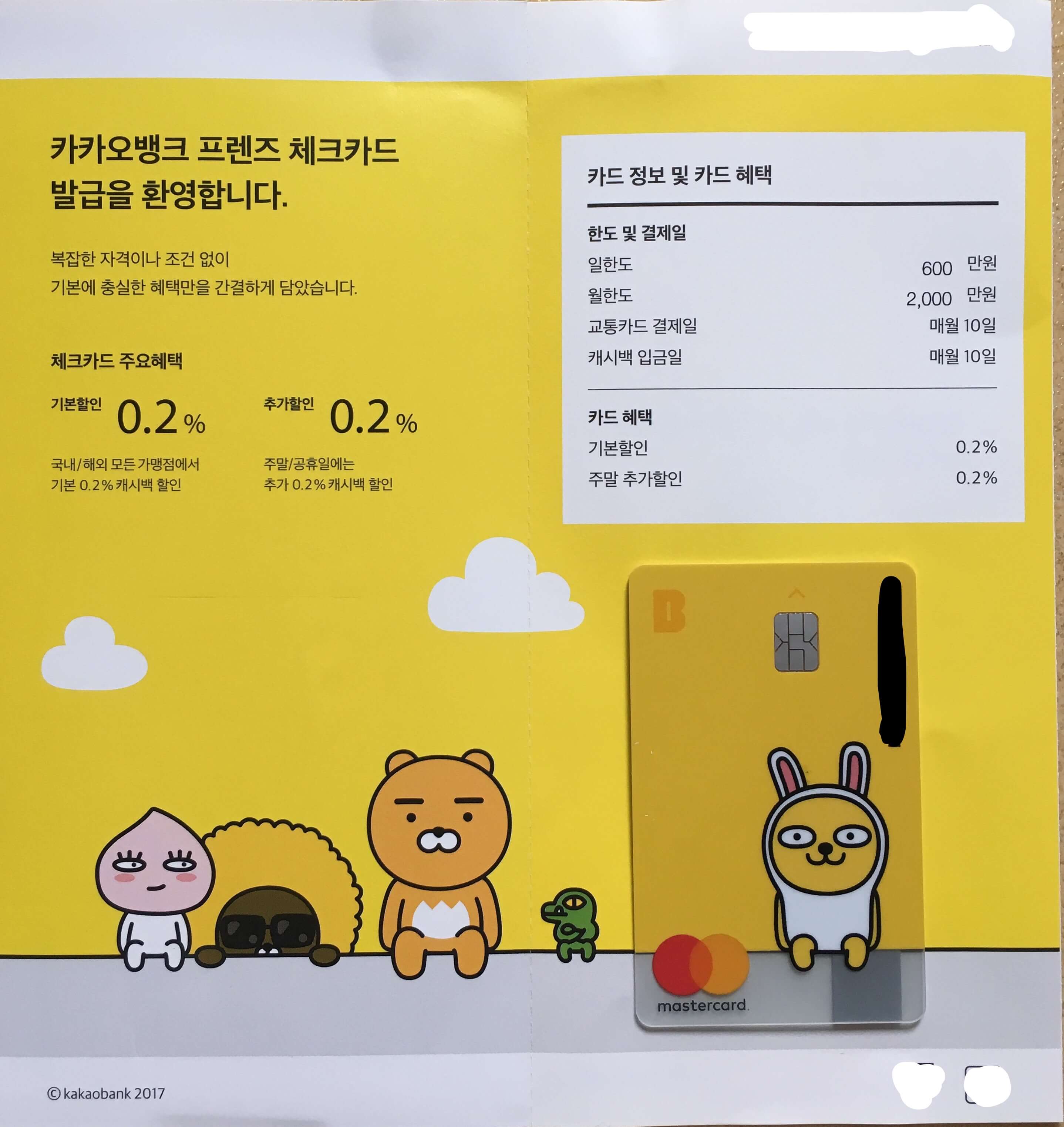 웰컴 기프트를 봤으니, 이제 주인공인 카드를 봅시다. 저는 무지가 그려진 카드를 신청했는데요. 카드 뿐만 아니라 문서까지도 전체적으로 디자인이 깔끔합니다. 필요한 내용이 눈에 잘 들어오고, 곳곳에 카카오 프렌즈 캐릭터도 있어서 보는 재미도 있습니다.
