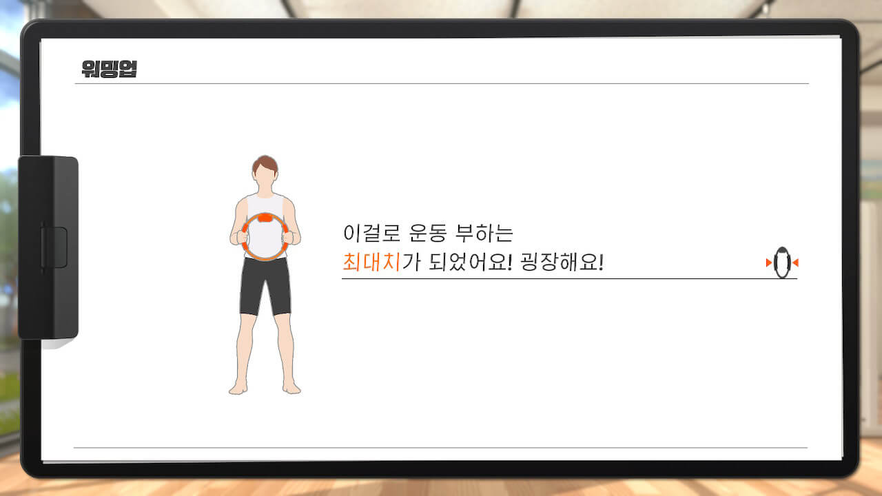 스테이지 구성이 다리 → 배 → 팔 운동 순으로 배치돼있습니다. 초반부에는 공격력 강한 게 다리 운동밖에 없어서 왜 그런가 했더니, 나중에 순차적으로 추가되더라고요. 이게 근육이 잘 붙는 순서라고 합니다. 오오, 닌텐도의 큰 그림.