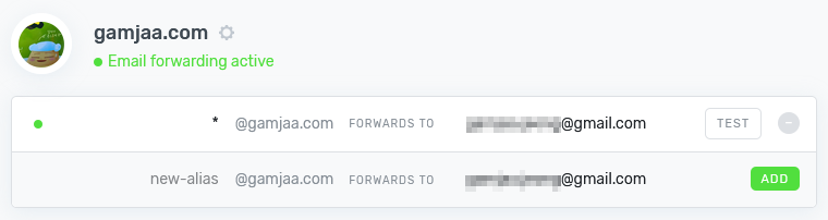 기본적으로 *@gamjaa.com 와 같이 제 도메인으로 들어오는 모든 메일을 전달하도록 설정돼있습니다. 필요에 따라서 추가/수정하시면 됩니다. 설정하시고 Test 를 눌러서 정상 동작하는지 확인하세요.