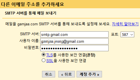 포트(587)와 TLS 보안 연결은 그대로 두고, 계정 추가 를 클릭합니다.