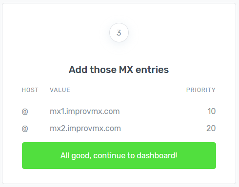 이런 식으로 자신의 도메인에 맞춰서, mx1.improvmx.com 와 mx2.improvmx.com 둘 다 추가해주시면 됩니다. MX 레코드 설정이 끝나면 Dashboard로 이동해주세요.