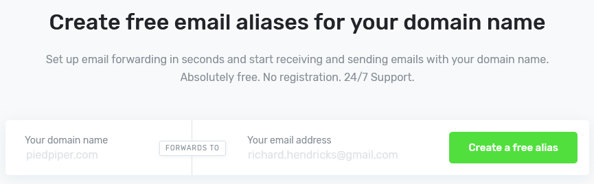 ImprovMX 에 접속하면 가장 먼저 보이는 부분입니다. 각각 자신의 도메인과 전달받을 이메일 주소(지메일 추천)를 입력 하시면 됩니다. 입력 후 Create a free alias 를 클릭하세요.