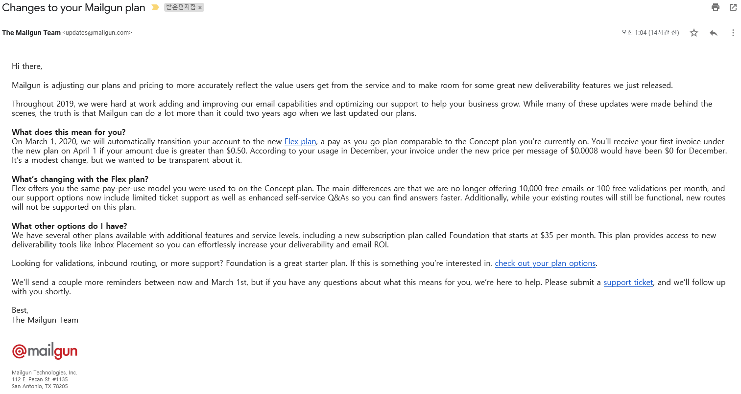 mailgun 무료 플랜이 3월 1일로 종료 됩니다. 앞으로는 메일 1,000개 당 0.8달러의 요금이 청구된다고 합니다. (첫 3달간 월 5,000개 무료) 2년 넘게 무료로 잘 써왔는데 아쉽습니다. 어쩔 수 없는 선택 같지만요. 비싼 요금은 아니지만, 굳이 돈 내고 쓸 정도로 많이 쓰지도 않는 상황이라서 대안을 알아봤습니다.