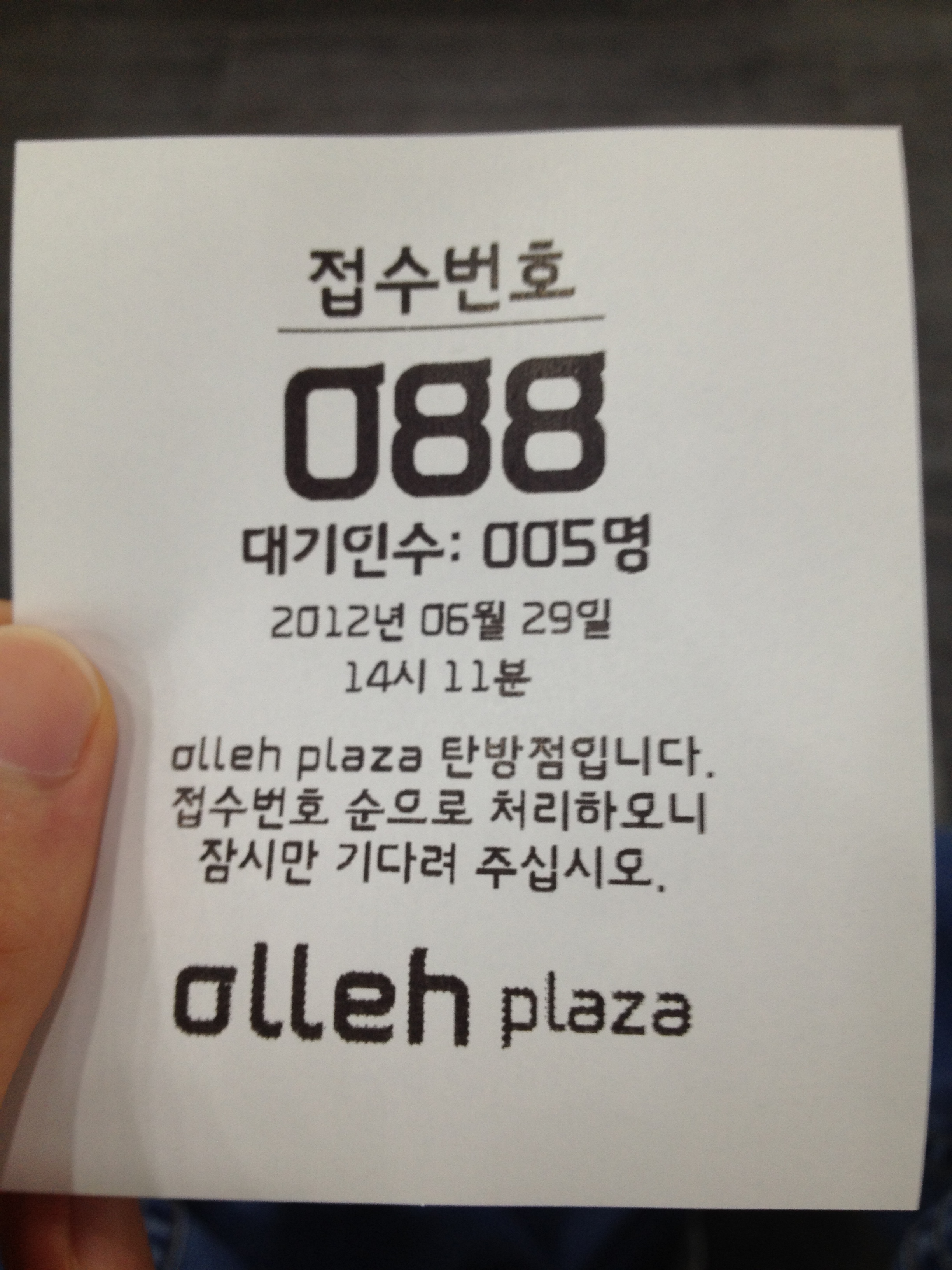 올레체를 사용한 올레 프라자 대기표입니다. 여기서 30분 정도를 낭비했어요…